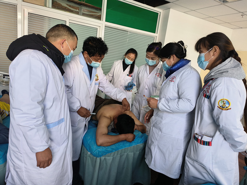 圖為恰燈郎朗帶領(lǐng)徒弟為患者治療。