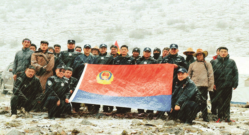 然而,高原的天、娃娃的臉,說變就變。剛剛還艷陽高照的晴好天氣,瞬間寒風(fēng)四起,鵝毛大雪不一會便覆蓋了整個山野。由于到達(dá)蟲草采集點(diǎn)還需4、50分鐘人力轉(zhuǎn)運(yùn)物資,受天氣影響,前行受阻,擔(dān)任護(hù)送任務(wù)的民輔警當(dāng)即幫助群眾搭建臨時安置點(diǎn),風(fēng)雪中警民互助的身影像極了一家人。一切收拾停當(dāng),盡管風(fēng)寒雪大,條件艱辛,樂觀的群眾和伴隨服務(wù)的民輔警還不忘在風(fēng)雪中來一張合照,他們說,這是歷年來的慣例,每次上山采集蟲草和下山返程,他們都會一個不少地拍張“全家福”,以此留念蟲草季警民相依的美好記憶。