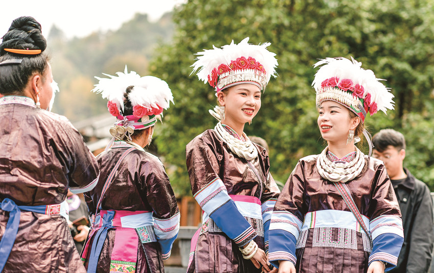 在貴州省黎平縣肇興侗寨,侗族群眾身穿節(jié)日盛裝參加侗年活動。