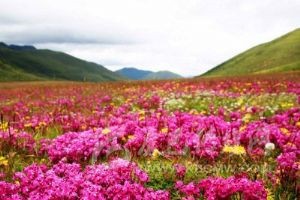 木雅圣地景區(qū)坐落于康定折多山西側(cè)的“木雅辛康”,是一座以民俗風(fēng)情與自然風(fēng)光相結(jié)合的,以體現(xiàn)藏族木雅文化為主題的專題旅游區(qū)。擁有雪山、草原、花海、河流、湖泊和木雅藏族民俗文化等眾多旅游景觀,共有5個(gè)主要景點(diǎn),“花海尋蹤”是當(dāng)年木雅公主很愛游玩之地,也是整個(gè)景區(qū)花開得很早很茂盛的地方。“梵音送?!笔悄狙诺貐^(qū)享有盛名的藏傳佛教寺廟?!疤旖缒粮琛笔悄狙艊?guó)傳統(tǒng)的冬季放牧之地,這里牧草極為豐富?!胺鹩幽狙拧笔且粋€(gè)用經(jīng)幡制作而成的釋迦牟尼佛像?!叭悍鍑痢笔亲o(hù)衛(wèi)木雅國(guó)的一道天然屏障。