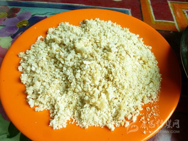 奶渣是奶提煉酥油后剩下的物質,經(jīng)燒煮,水份蒸發(fā)后,剩下是奶渣,奶渣可以做成奶餅、奶塊。在煮牛奶過程中,還可揭起奶皮,藏語叫“比瑪”。奶皮就像豆腐皮一樣,好吃又富有營養(yǎng)。奶品是藏族的重要食品,家居或外出,人們都帶上它。在零食品種不多的藏區(qū),大人們常把奶渣給小孩當零食。麻森在盤子里放上適量的糌粑、酥油、碎奶渣及碎紅糖,攪混揉合,盛入一方形小木盒內,用手塞滿、壓實,即可制成麻森方形糕,其味香甜可口。