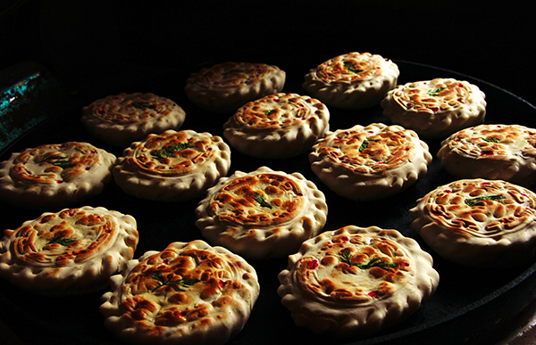 何謂“花饃饃”,顧名思義,就是用面粉做成的一種夾心并模印圖案的薄餅。一般“花饃饃”的厚度約一指厚,直徑為13厘米左右。制作“花饃饃”時,一定要用新打出的本地面粉(用新面意為喜慶豐收)并不加發(fā)酵的老面(主要防止饃饃以及饃饃上的圖案變形),只加少許蘇打以水揉面即可。心子是由藏族特有的食品酥油、糌粑、奶渣等拌上紅糖或白糖而成。先將揉好的面粉揉成巴掌大的面坨,把調(diào)好的心子包在面坨內(nèi),然后壓平,盡量使它變成圓形,并在“花饃饃”的最中心粘一小片青綠的蘿卜葉,然后用雕有各種圖案的印板印上圖案。