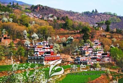民居外表主要由棕白兩色構(gòu)成,白色的屋頂,白色的主墻,木結(jié)構(gòu)處多用棕色顏料染涂,其間配以紅、藍圖案,在藍天、白云、青山、綠水的映襯下,幻化成妙不可言的積木圖案。白色的房頂與寬敞的院壩里,身著艷麗藏裝的少女或身著絳紅色衣衫的喇嘛飄拂其間,給人一種“世外桃源”的感覺。